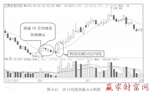 比如,江西水泥(000789)在2011年5月股價連續下跌,到月底上行突破10 日均線,但隨后便繼續下跌,進行回抽確認。直到6月14日,一根大陽線有效突破I0日均線,股價才一路報升。如圖所示。