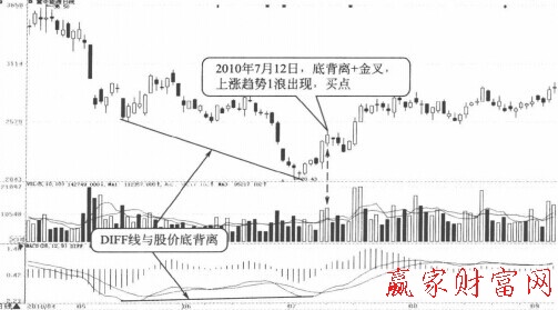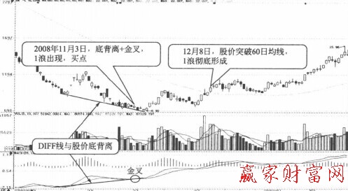 因此,投資者在下跌趨勢中,一旦見到“DIFF線與股價底背離+金叉”,就要注意1浪的出現。