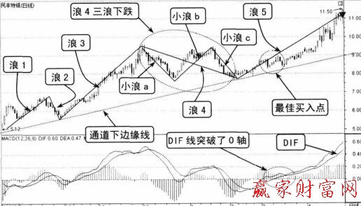 觀察圖中我們可以發(fā)現(xiàn)在浪5的前面部分,MACD線中的DIF指標(biāo)線出現(xiàn)了穿越0軸的現(xiàn)象。在這之后,股價(jià)展開了浪5的上漲行情,股價(jià)從8.50元左右,最高上漲到了11.50元,漲幅達(dá)到了35%。