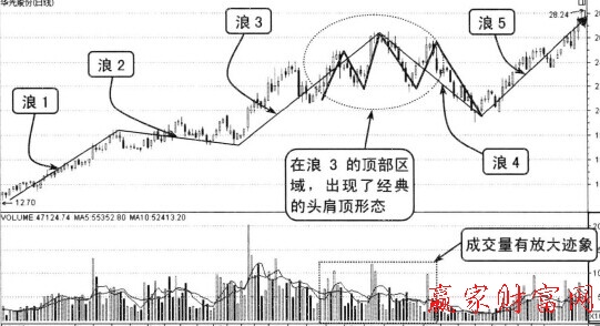 2.頭肩頂K線形態出現在浪3和浪4階段,即虛線圓圈內。具體地說,第一個高點走浪3延長浪中的第三浪頂部;第二個高點是指浪3的頂部;第三個高點是浪4階段的第二浪,即下跌中反彈浪的高點。