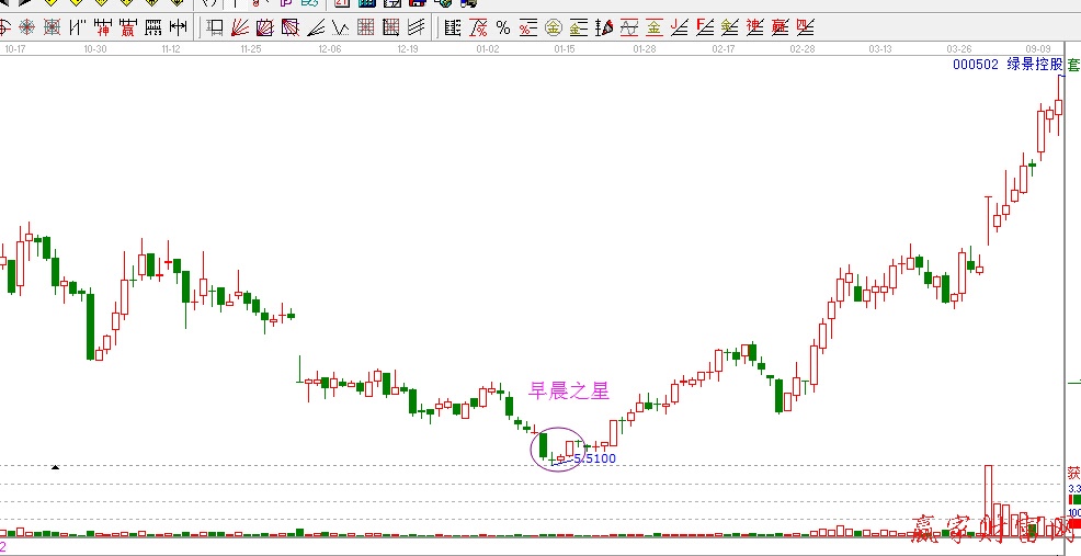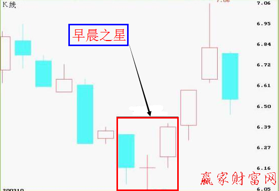 定義:早晨之星又稱為“黎明之星”、“希望之星”,在生活中指的就是在太陽尚未升起的時(shí)候,黎明前最黑暗的時(shí)刻,一顆明亮的啟明星在天邊指引著那些走向光明的夜行人,預(yù)示前途光明,美好終將到來。而在股市里該形態(tài)則是由三根K線組成的K線組合,它是一種行情見底轉(zhuǎn)勢的形態(tài),預(yù)示著行情下跌將要結(jié)束,股價(jià)上漲即將到來。如果該形態(tài)出現(xiàn)在下降趨勢中應(yīng)引起注意,因?yàn)榇藭r(shí)趨勢已發(fā)出比較明確的反轉(zhuǎn)信號(hào),是一個(gè)非常好的買入時(shí)機(jī)。
