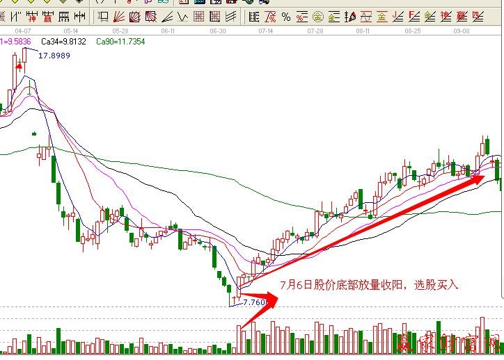 底部的放量止跌說明有抄底資金入場,投資者可在成交量繼續放量時買入。