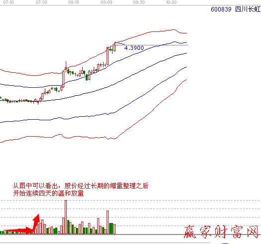 1、上漲過程中的溫和放量。這是指一只個股的成交量在前期持續低迷之后,突然出現一個類似“山形”一樣的連續溫和放量形態。這種放量形態,稱作“量堆”。個股出現底部的“量堆”現象,一般就可以證明有實力資金在介入。但這并不意味著投資者就可以馬上介入,一般個股在底部出現溫和放量之后,股價會隨量上升,量縮時股價會適量調整。此類調整沒有固定的時間模式,少則十幾天多則幾個月,所以此時投資者一定要分批逢低買入,并在支持買進的理由沒有被證明是錯誤的時候,有足夠的耐心用來等待。需要注意的是,當股價溫和放量上揚之后,其調整幅度不宜低于放量前期的低點,因為調整如果低過了主力建倉的成本區,至少說明市場的拋壓還很大,后市調整的可能性較大。 如圖