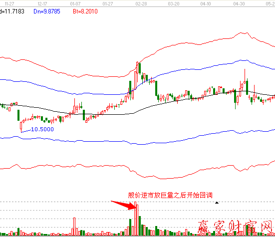 2、突放巨量。對此種走勢的研判,應該分作幾種不同的情況來對待。一般來說,上漲過程中放巨量通常表明多方的力量使用殆盡,后市繼續上漲將很困難。而下跌過程中的巨量一般多為空方力量的最后一次集中釋放,后市繼續深跌的可能性很小,短線的反彈可能就在眼前了。另一種情況是逆勢放量,在市場一片喊空聲之時放量上攻,造成了十分醒目的效果。這類個股往往只有一兩天的行情,隨后反而加速下跌,使許多在放量上攻那天跟進的投資者被套牢。如圖