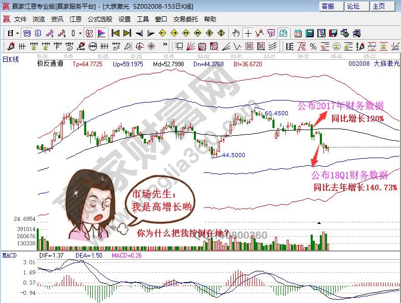 問題一:3月17日大族激光公司2017年年報,營收與凈利增速均在1倍以上,4月23日公司公布2018年一季報數據,凈利潤同比增長140%,而股價兩根大陰棒。