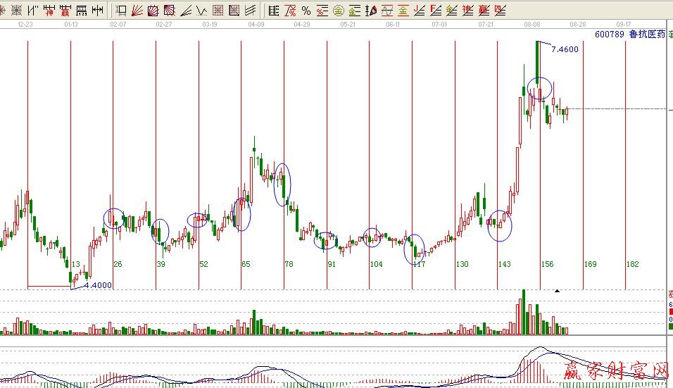 江恩理論中,江恩認為,市場的底部和頂部都是根據周期的規律而得來的。市場的價格和走勢的形態也是根據時間周期的變化而重復出現的。等距時間周期形成的原因是因為它每個循環周期都是相同相等的,看似簡單的工具,蘊含著巨大的作用,相同的時間產生相同的結果,下面以600789為例給大家說明。