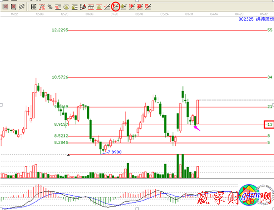 2、從上圖可以看到3.25日漲停突破13、21線,然后縮量回踩跌破21到13線位置,橫盤幾天一直未破,4.2日是漲停后下跌的第6天,大家都知道在