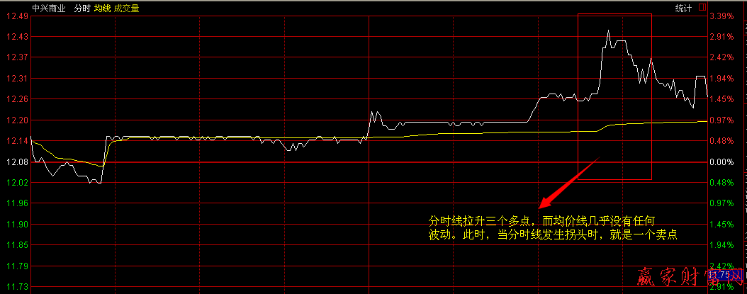而如果出現分時線向上運行,而均價線反應遲鈍的異常情況時,如下圖所示。此時,說明市場中有人在利用資金進行虛假拉升或主力為了出貨拉升。此時,我們就應及時在高點清倉出局。