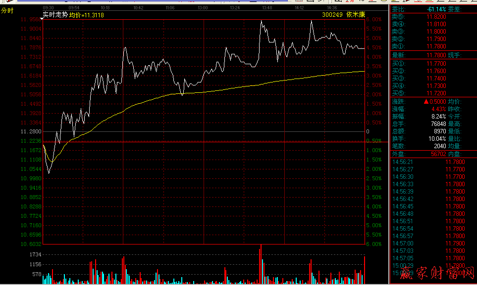 300249依米康,屬于機械行業板塊,2014年5月8日分時曲線,當日開盤價是11.2元,當日股價高開低走,股價線下落到開盤價之下,一直到股價線突破開盤線之前,都在開盤價格之下運行,股價在突破頸線位置是很好的買點,上穿頸線買進,是重要的短線指標。日線圖中也顯示,當日成交量7.68萬,換手率10.04%,各項指標走勢良好,短線可以介入。