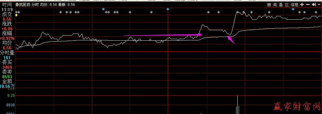 這里的平臺突破包含以下特征:股票的價格在某一位置盤整超過半小時;同時股票價格的走勢貼著均價線的走勢,兩者大致處于同一水平線上,這時候股票波動幅度比較小;這時候均價線也是基本上呈一水平線,幾乎沒有波動;均價線向上越過平臺的最高點后買入。比如2014年9月18日魯抗醫藥(600789)的分時圖。