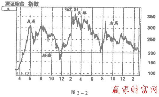 頭肩式殺傷力極大,上圖是深圳幾年波動(dòng)中形成的頭肩圖,它使起初靠原始股起家的大戶被無(wú)情消滅。