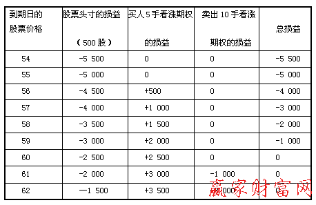 買入5手6月執行價格為55美元的看漲期權,權利金為每股4美元;賣出10手6月執行價格為60美元的看漲期權,權利金為每股2美元。