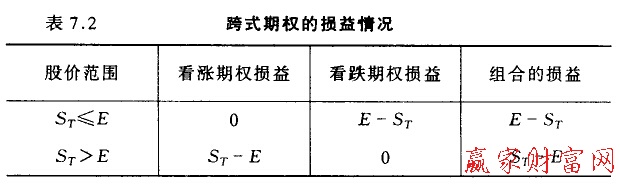 跨式期權(quán)(Straddle)策略是組合期權(quán)中最為被普遍使用的方法。同時(shí)買(mǎi)人具有相同執(zhí)行價(jià)格、相同到期日、同種股票的看漲期權(quán)和看跌期權(quán)就可以構(gòu)造該策略,其損益狀態(tài)如圖7.9所示。執(zhí)行價(jià)格用E來(lái)表示。如果在個(gè)股期權(quán)到期日,股票價(jià)格和執(zhí)行價(jià)格幾乎相同,跨式期權(quán)產(chǎn)生損失是不可避免的。但如果股票價(jià)格在任何方向上都有很大偏移時(shí),就會(huì)有大最的利潤(rùn)。表7.2計(jì)算了該期權(quán)策略的損益。