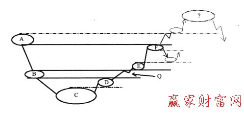A和C是股價由漲轉跌和由跌轉漲的兩個重要分歧區,B是下跌中的一個較大的次級波動區。圖中,Q所指處代表價格通過分歧區時往往會比較曲折,在穿越過程中耍時刻警覺,防備價格無力突破而轉頭向下。突破密集成交帶后(密集成交帶多是分歧區的中間部位,或者可以結合成交量來把握)一般還會上漲。