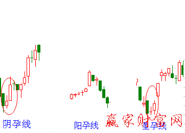 ②前一條K線是一條長大的陰線,第二條K線是一條短小的陽線,稱為陰孕陽線,或簡稱陰孕線。