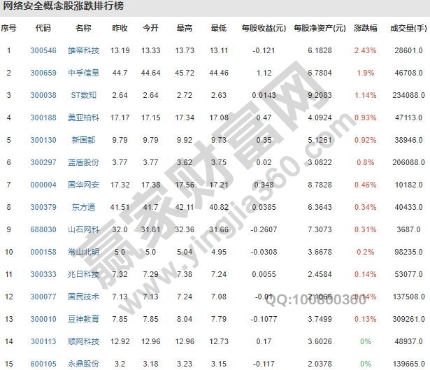 這些股票都屬于網絡安全概念:300546雄帝科技、300659中孚信息、300038ST數知、300188美亞柏科、300130新國都、300297藍盾股份、000004國華網安、300379東方通、688030山石網科、000158常山北明、300333兆日科技、300077國民技術、300010豆神教育、300113順網科技、600105永鼎股份、600718東軟集團、300479神思電子、300588熙羨信息、002197證通電子、300352北信源、603232格爾軟件、300079數碼視訊、600289*ST信通、300324旋極信息、600410華勝天成、600100同方股份、002439啟明星辰、300229拓爾思、603636南感軟件、688168安博通、300311任子行、600271航天信息、300386飛天誠信、000034神州數碼、601360三六零、002268衛士通、600487亨通光電、600776東方通信、600536中國軟件、300579數字認證、000063中興通訊、688023安恒信息、002212天融信、300369緑盟科技、000066中國長城