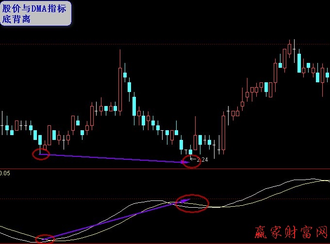 從上圖中也可以看出,當(dāng)DDD線上穿AMA線形成金叉時(shí),就是一個(gè)買入信號(hào);而DDD線下穿AMA線形成死叉,即是賣出信號(hào)。在使用過程中,還有其他炒股技巧,比如當(dāng)股價(jià)與DMA指標(biāo)形成底背離或者頂背離時(shí),都是明確的買賣信號(hào)。如下圖所示。