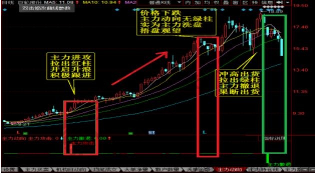從上面這個(gè)圖我們可以發(fā)現(xiàn),比較明顯的買賣信號就是主力進(jìn)攻紅柱和撤退綠柱,但是并不常見,一般常見的情況是主力隱藏的非常好并不會發(fā)出非常猛烈的攻勢,主力動(dòng)向指標(biāo)沒有柱子只有色區(qū),這個(gè)時(shí)候我們就需要根據(jù)紅綠色區(qū)來判斷。