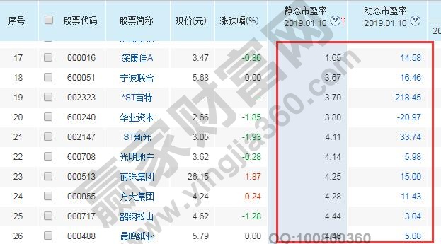通常提到的市盈率為靜態市盈率,以目前的市場價格比上已經公布的每股收益后一直,在一段時間內是不變的,通俗的意義表示一個企業要花費多長的時間才能收回自己的成本,這個值處于10-20年之間都比較正常,時間越長說明公司花費時間越長。動態市盈率則是用靜態市盈率比上下一年年度利潤增長率。靜態市盈率表示代表的是過去時間內公司的估值,而動態市盈率則是對于未來的一種預測。在具體使用的時候,不能說那個好,那個不好,可以結合使用,動態市盈率上漲高于靜態市盈率說明公司業績正在走壞;相反則是公司正在上漲走勢。另外就是觀察動態市盈率的持續性,長期低于靜態市盈率則是公司處于冉冉升起的狀態。因此除了對于動態市盈率的排名查詢之外,還需要兩者對比,這個可以在同花順問財上得到結解決,如下圖所示。