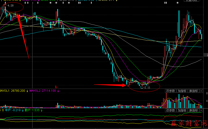下圖為蕪湖港日K線圖,2013年2月25日創出4.28的高點之后,出現箱體整理,兩個月時間,股價一路狂跌,一直到后期收盤于2.11元。當天出現標志性的長下影線的小陰線,這就是我們所說的探底針。股價下探又迅速拉回,說明此位置有較強的承接盤,股價下跌空間已被封死。后市股價能放量走高,投資者可積極入場。該股后市放量大漲。