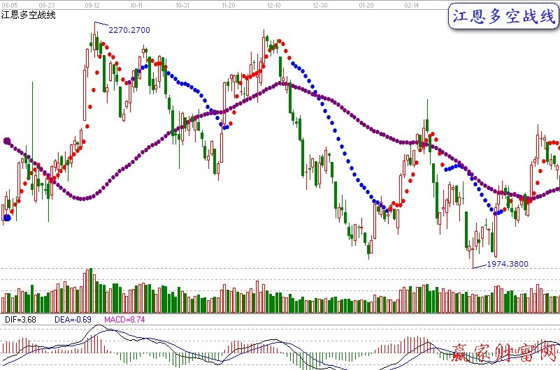 江恩多空戰線是由普通K線、紫色趨勢線、紅色點線和藍色點線組成。