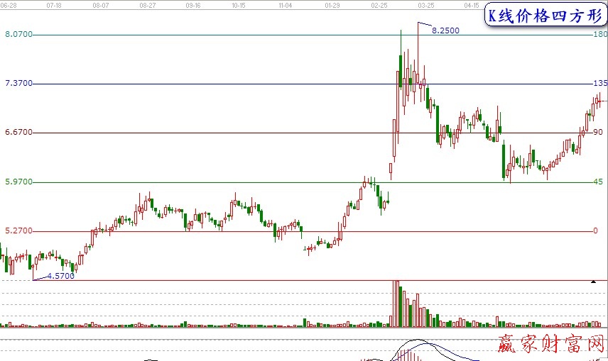K線價格四方形源于江恩理論的四方形,分為價格四方形、時間四方形,價格四方形用于研判指數和個股的支撐和阻力。在價位的1/2、1/3、1/4及1/8的分割比率,可以預計市場的支撐及阻力位。