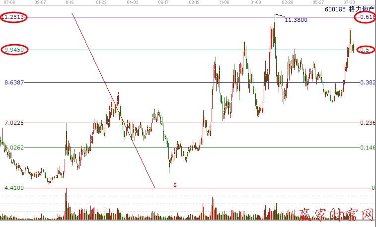 其次考慮價(jià)格。對(duì)價(jià)格分析是為了精確把握買賣點(diǎn),該股目前價(jià)位較高,因此對(duì)買點(diǎn)進(jìn)行精確把握,可以降低操作風(fēng)險(xiǎn)。對(duì)于格力地產(chǎn)來說,該形態(tài)我們通過黃金分割回調(diào)支撐線來判斷,將2009年12月15日高點(diǎn)與2012年1月6日低點(diǎn)分割。如下圖,從圖中可以看出該股目前處于黃金分割比率0.5上,也就是當(dāng)前支撐位是9.94附近,阻力是0.618位置11.25附近。因此,從價(jià)格上來看,該股處于支撐位附近,可以建倉(cāng)買入。