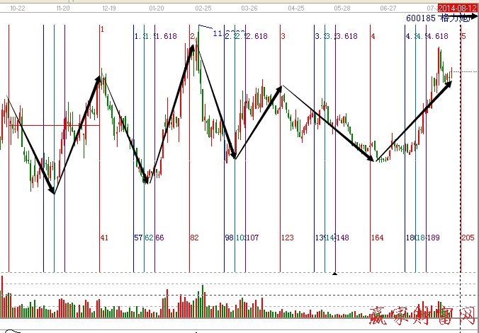 黃金時(shí)間周期線對(duì)該股時(shí)間周期進(jìn)行分析,選擇2013年10月15日高點(diǎn)為起點(diǎn),2012年12月11日高點(diǎn)為終點(diǎn),做出分析圖如下,從圖中可以看出,該股目前這波行情還沒有走完,其下個(gè)時(shí)間窗口是8月12日。