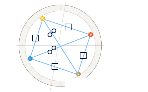 所以,“圖形相位”就是以特別圖形形狀展現的相位組合,包括群星匯聚(Stellium)、三刑會沖(T-Square,也被稱為“T 三角”)、大三角(Grand Trine)、風箏相位(Kite)、大十字相位(Grand Cross)、神秘長方形(Mystic Rectangle)以及上帝手指(Yod)等等。占星圖中每一種圖形相位都由多種相位和行星的組合而成,需要達到特定條件才能成型,所以也會使圖形相位自身帶著著復雜和累加的能量。有一點需要注意,圖形相位雖然會帶來強于一般相位的能量效用,但是最終效果不僅與相位本身有關,也和參與的星體能量本身息息相關,并不能一味的以圖形相位的出現就斷言好與壞。當然,星盤中圖形相位的出現一定會令此人的人生更加精彩,帶來機遇或者危機,但最后的成就高低卻需要看星盤本身格局而定。圖形相位只會對星盤格局起到調整和加成作用。成也蕭何敗也蕭何,圖形相位自身的局限性同樣可能對命主帶來限制,不能一言以蔽之。