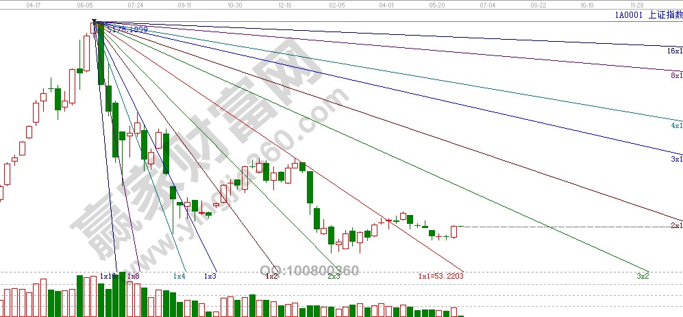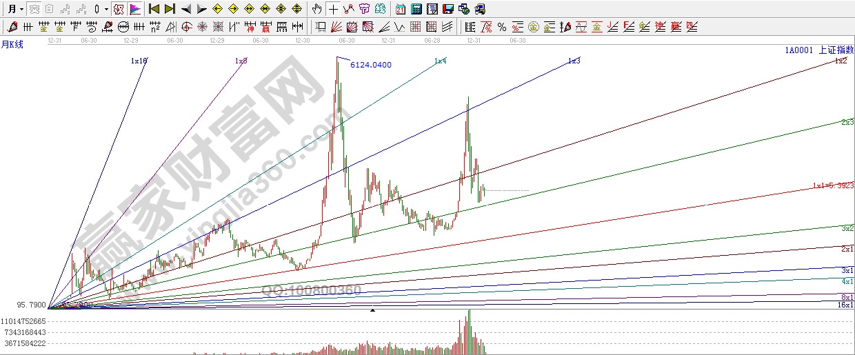 首先我們先舉個例子。上證,95點開始上升角度線。(選用的周期不同,對于未來的影響也是不同的),