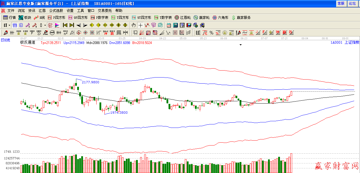 ★依據贏家江恩系統極反通道提示:在權重的帶動下,攻擊藍色外軌線,外軌線阻力2120點。