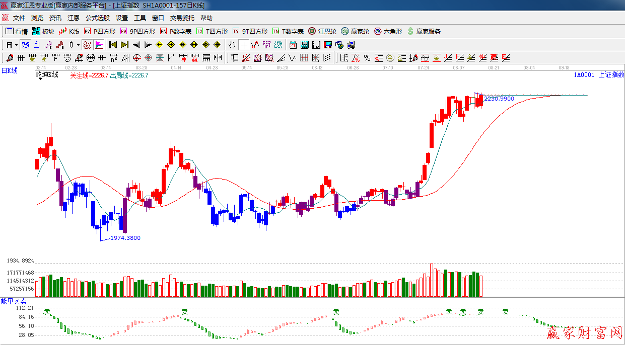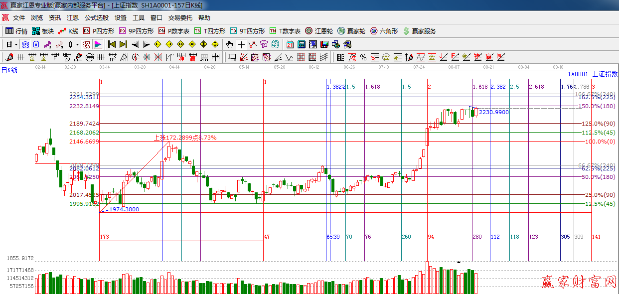江恩看盤綜述:依據贏家江恩技術工具分析得出:,指數受利好推動展開反彈,但180度2232點阻力憂在,量能較前一交易日萎縮,短期市場仍有震蕩可能,但中期向上趨勢良好。操作上,合理控制倉位,做好高拋低吸。