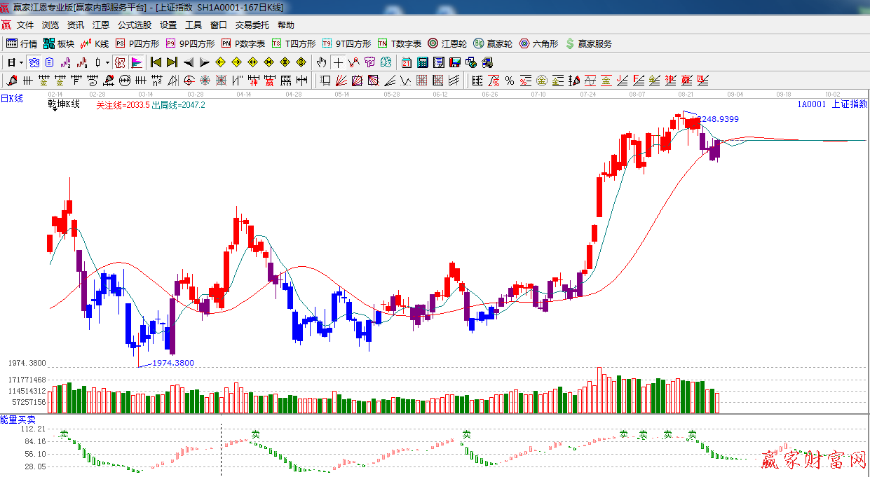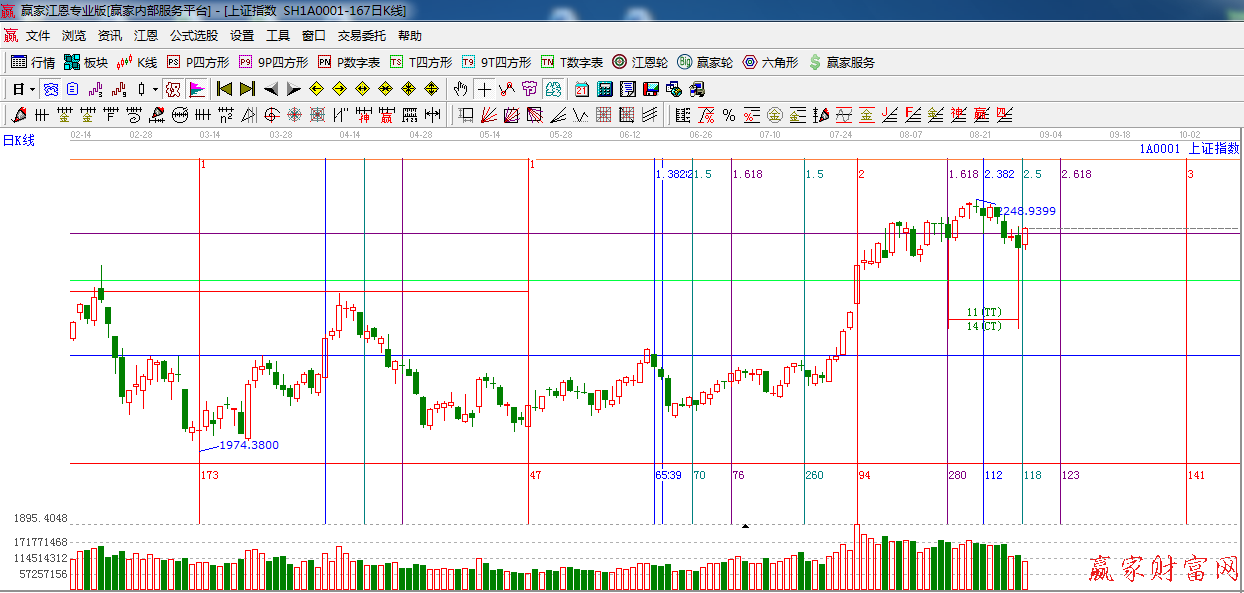 江恩看盤綜述:依據贏家江恩技術工具分析得出:指數震蕩反抽,極反通道藍色外軌線,成交量漸趨萎縮,外軌線是2221點,此位置不能放量收復,市場短期將仍以震蕩反復為主,操作,謹慎為主,做好高拋低吸。