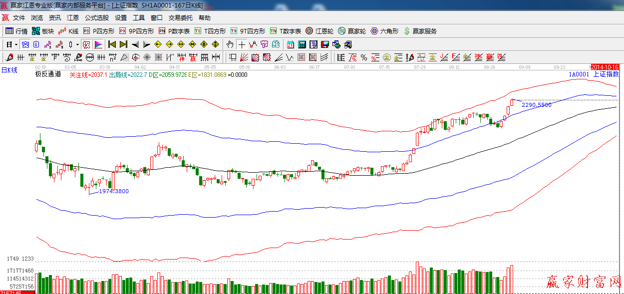 ★依據(jù)贏家江恩系統(tǒng)極反通道提示:繼續(xù)放量上行,整體趨勢看多,上方外軌線阻力2318點(diǎn)附近。