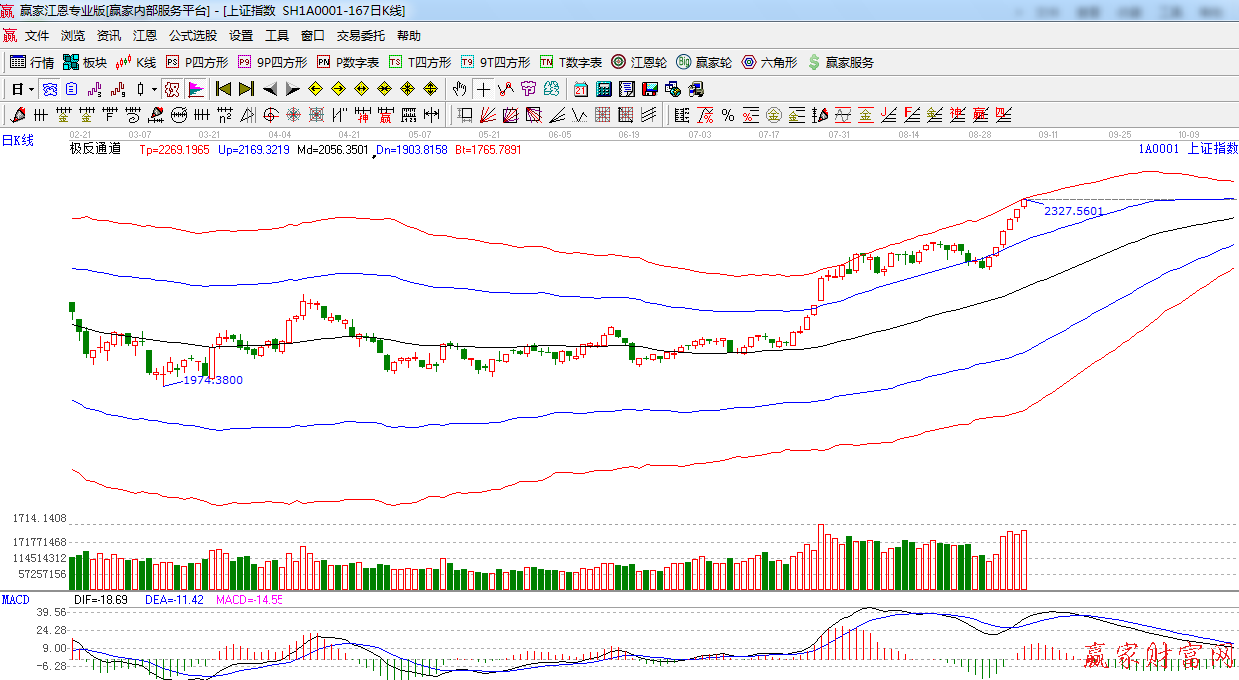 上周,滬深兩市在資金推動(dòng)下,呈單邊上漲走勢(shì),連續(xù)突破2250點(diǎn)以及2300點(diǎn)兩大阻力位,刷新年內(nèi)新高,板塊方面出現(xiàn)普漲,其中航天軍工、港口等板塊更是表現(xiàn)突出,截止周五收盤,上證指數(shù)已經(jīng)站上了2326點(diǎn),上周五又是前期提到的時(shí)間之窗,指數(shù)又面臨上方極反通道紅色外軌壓力,短期將結(jié)束前期伶俐走勢(shì),轉(zhuǎn)入震蕩,預(yù)計(jì)本周將沖高回落,操作上,謹(jǐn)慎為主。