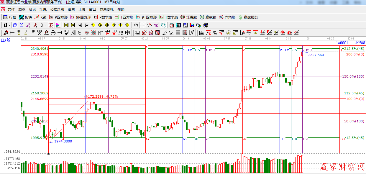 ★依據(jù)贏家江恩系統(tǒng)波段百分比提示:指數(shù)站穩(wěn)六角形90度角度線2210一線,一舉突破2300,2018點(diǎn),下一目標(biāo)位2340附近,