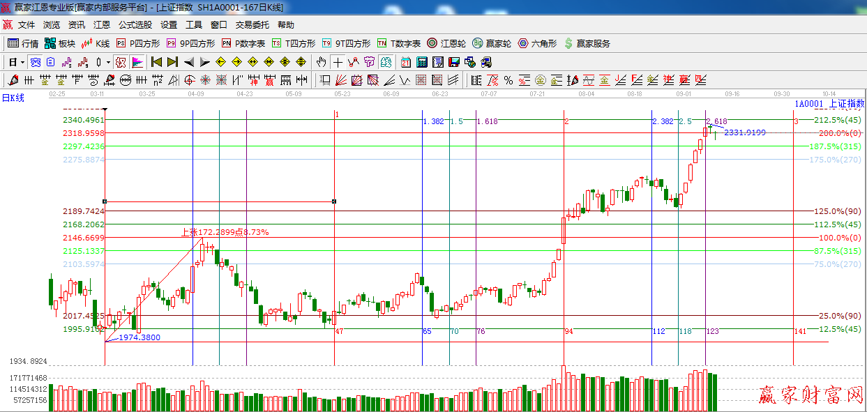 ☆依據贏家江恩系統黃金時間周期線提示:自上周五9月5日的時間窗口,再次收陰十字星,短期震蕩調整或將繼續。