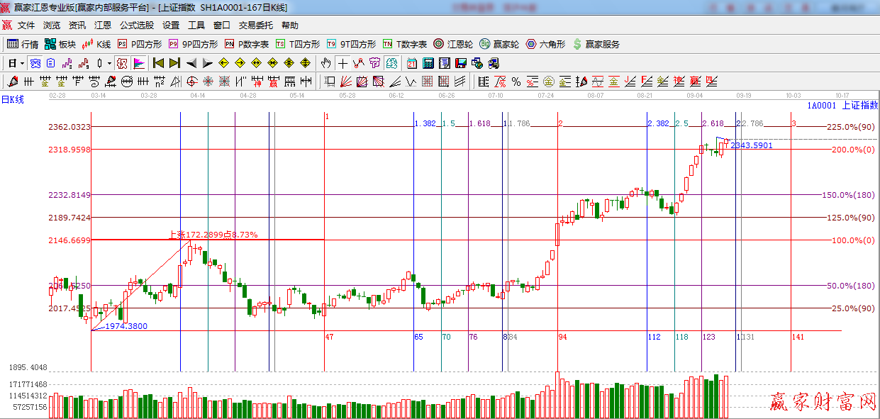 江恩看盤綜述:依據(jù)贏家江恩技術(shù)工具分析得出:周一低開(kāi)下探江恩0度支撐2318點(diǎn)后,再次震蕩上攻2340點(diǎn),終盤小陽(yáng)線報(bào)收,量能同比放大,9月9日之后的平臺(tái)整理,顯示多方蓄勢(shì)意圖,預(yù)計(jì)短期市場(chǎng)將繼續(xù)以震蕩攀升走勢(shì)為主,操作上,投資者切忌盲目追高和頻繁調(diào)倉(cāng)換股,可適當(dāng)降低倉(cāng)位。