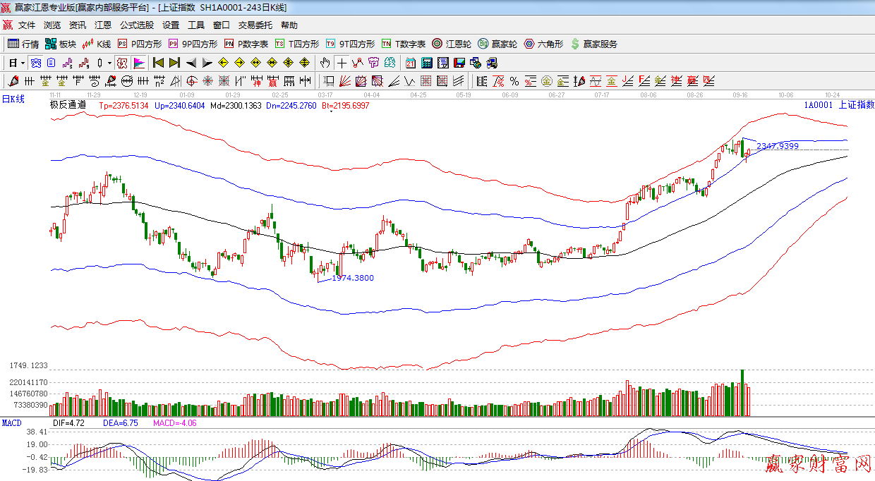 極反通道提示:外軌線上方縮量整理,外軌線支撐,2300點 ,此位置不破,謹慎看空。