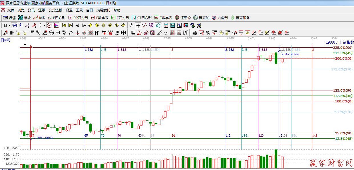 江恩看盤綜述:依據贏家江恩技術工具分析得出:今日上證指數在60分生命 線之上縮量震蕩,上方阻力位是15,30生命線2319點,明日早盤此位置如不能放 量突破,將延續震蕩走勢,重點觀察60分周期的最后一根k線走勢(此為60分周期 的0.618倍時間窗口),因為它將指明大盤短期方向。