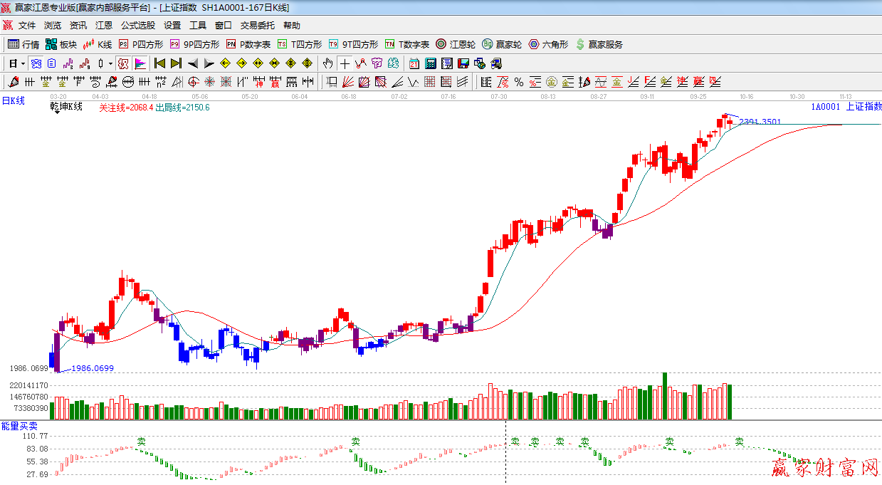 ☆依據(jù)贏家江恩系統(tǒng)能量買賣提示:紅色能量柱,與之前出現(xiàn)背離跡象,謹慎看多。