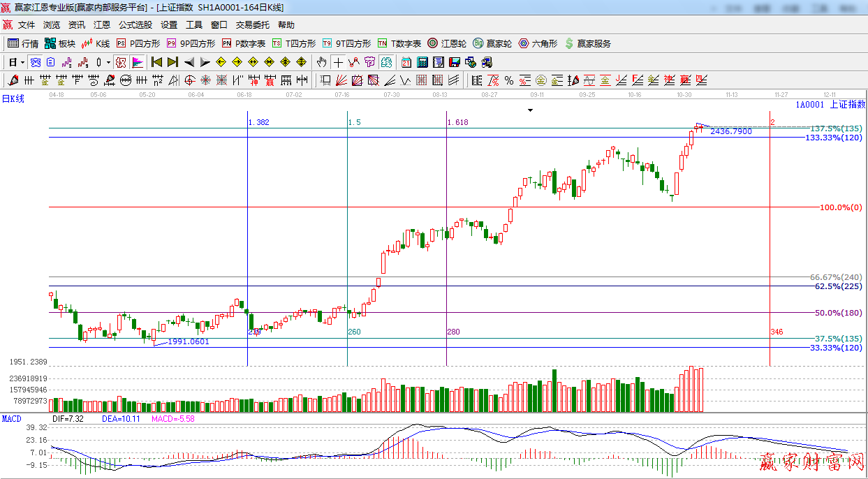 ☆依據(jù)贏家江恩系統(tǒng)黃金時(shí)間周期線提示:重點(diǎn)關(guān)注時(shí)間窗口是11月24日。