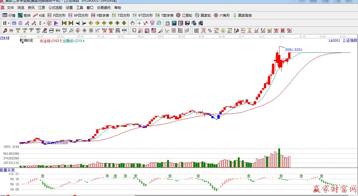 ★依據(jù)贏家江恩系統(tǒng)乾坤K線提示:紅色區(qū)域,綠色出局線之上,趨勢看多。