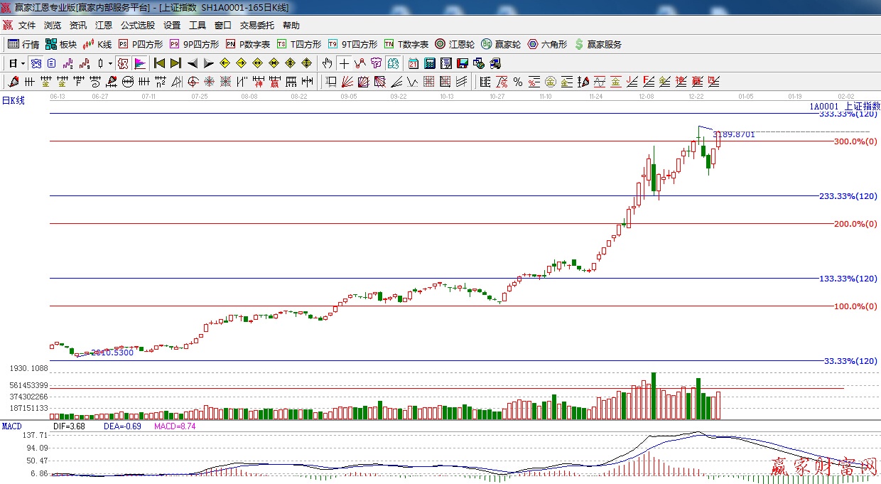 江恩看盤綜述:依據贏家江恩技術工具分析得出:上周五大盤在金融股的推動下延續反彈,收復江恩0度位置3111點,此位置回踩不破,指數將有繼續挑戰新高的可能。上方的階段阻力依然看江恩120度3257點,但從量能表現上短線風險仍然需要防范,操作上:適當控制一下倉位。
