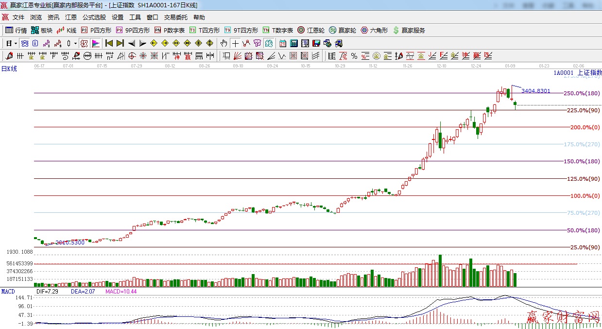 ★依據(jù)贏家江恩理論系統(tǒng)波段百分比提示:滬指低開下探,在江恩90度獲得支撐,180變?yōu)樽枇ξ唬?337點,另外上方阻力是240度,270度,3440點,3490點。
