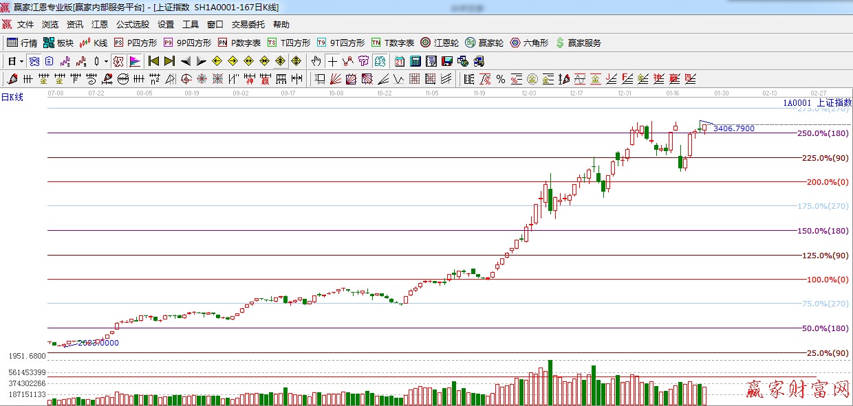 ★依據贏家江恩理論系統波段百分比提示:早盤滬指回探江恩180度支撐后,震蕩上行,180度3337點此位置不破繼續看多,上方目標位江恩270度3486點。
