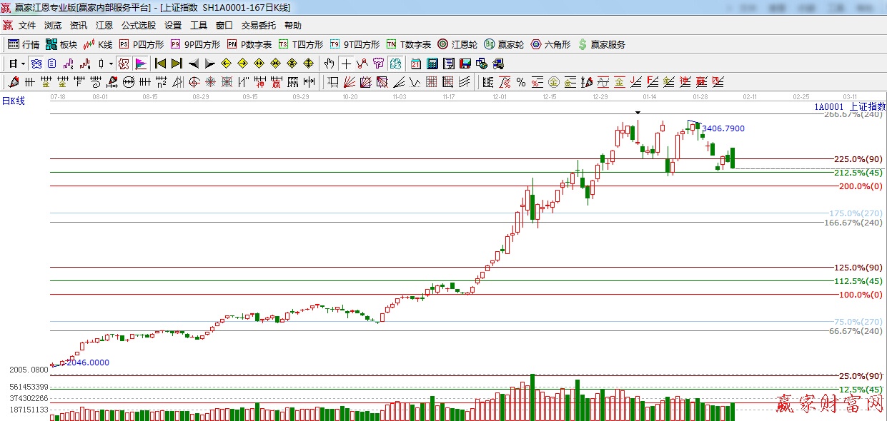 ☆依據贏家江恩理論系統波段百分比提示:高開回落,收盤破位江恩90度3188點,下方支撐是,江恩45度3114點,江恩0度位置3039點。