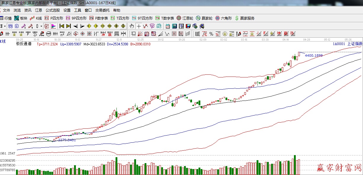 ★依據贏家江恩理論系統極反通道提示:紅色外軌超強區域,趨勢強勢,看多。