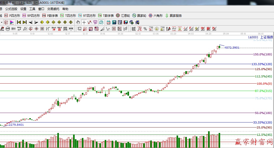 ★依據(jù)贏家江恩理論系統(tǒng)波段百分比提示:江恩百分比180度4300點附近支撐線,此位置不破整體趨勢不變,上方下一目標位是270度,4700點附近。