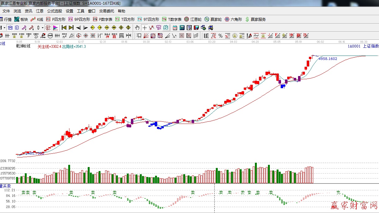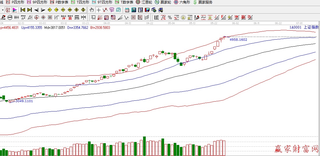 ★依據贏家江恩理論系統極反通道提示:滬指繼續強勢,沖擊5000點,紅色外軌線位置或有震蕩。